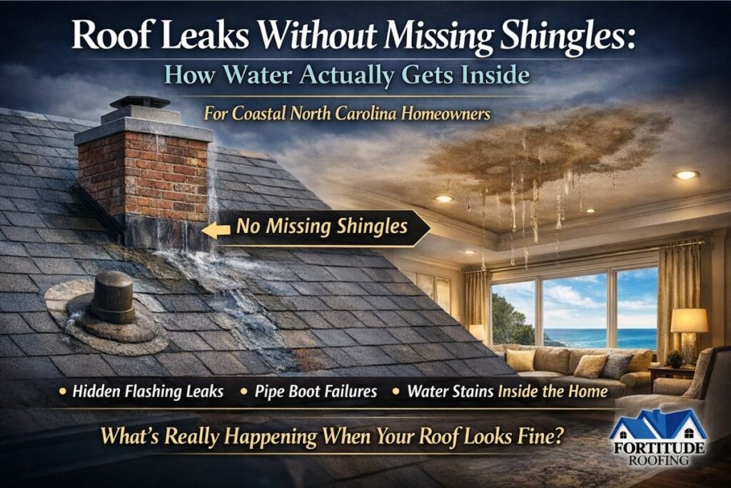 In reality, many serious leaks happen with shingles still in place—especially in coastal and storm-exposed North Carolina, where wind-driven rain, humidity, and repeat storm cycles exploit small system weaknesses. This guide explains how water gets inside when the roof looks intact, why stains often show up far from the entry point, and when to act.